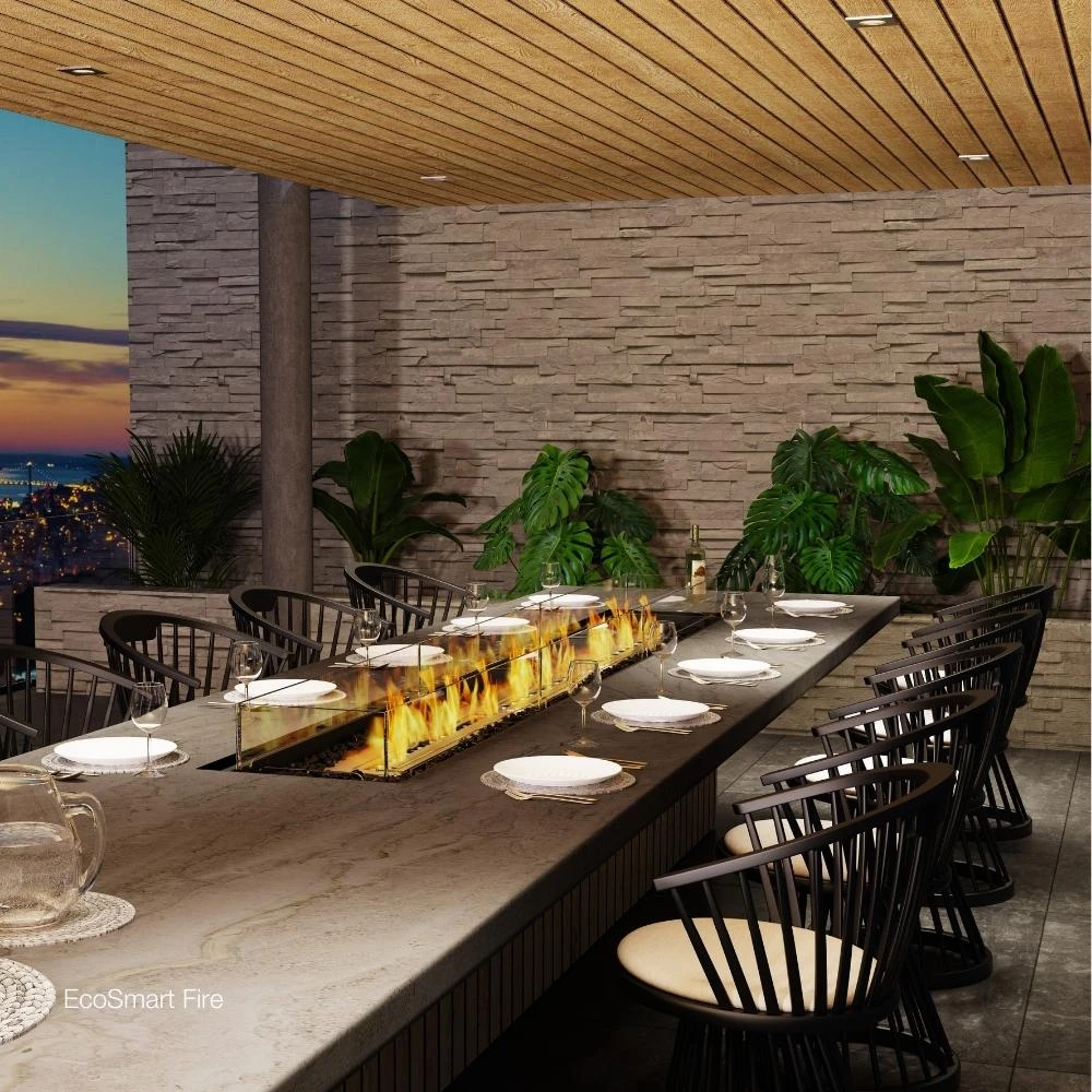 Three G35 burners are used for the gas models while the ethanol model utilizes three XL900 burners and comes with an indoor safety tray, making it safe for building custom dining tables for indoor dining. To heighten its elegance and look,ย each modelย is decorated with the included black glass charcoalย and surrounded by a toughened glass fire screen. DIY almost any kind of project as it easily integratesย intoย non-combustible platforms with cutouts like stone countertops, concrete surfaces, brick, and tiled tops.